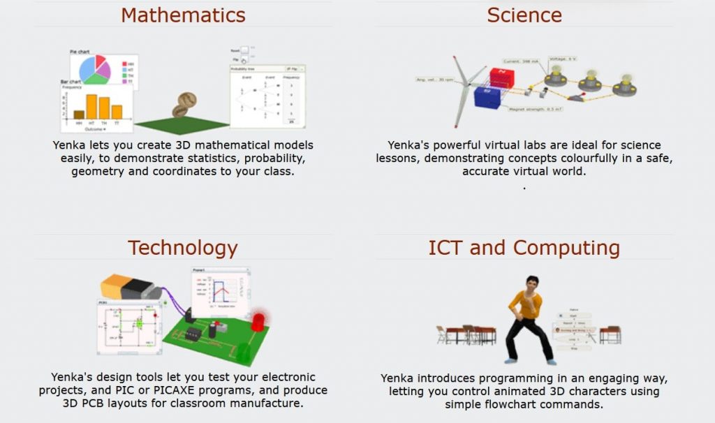 Yenka cung cấp đến người dùng những bài học thí nghiệm thú vị và độc đáo trong các lĩnh vực công nghệ, toán học, vật lý, hóa học, khoa học và máy tính. Ứng dụng tạo điều kiện tối đa cho người dung trong việc tương tác với các vật thể trong một phòng thí nghiệm ảo ví như kéo thả để lắp mạch điện.